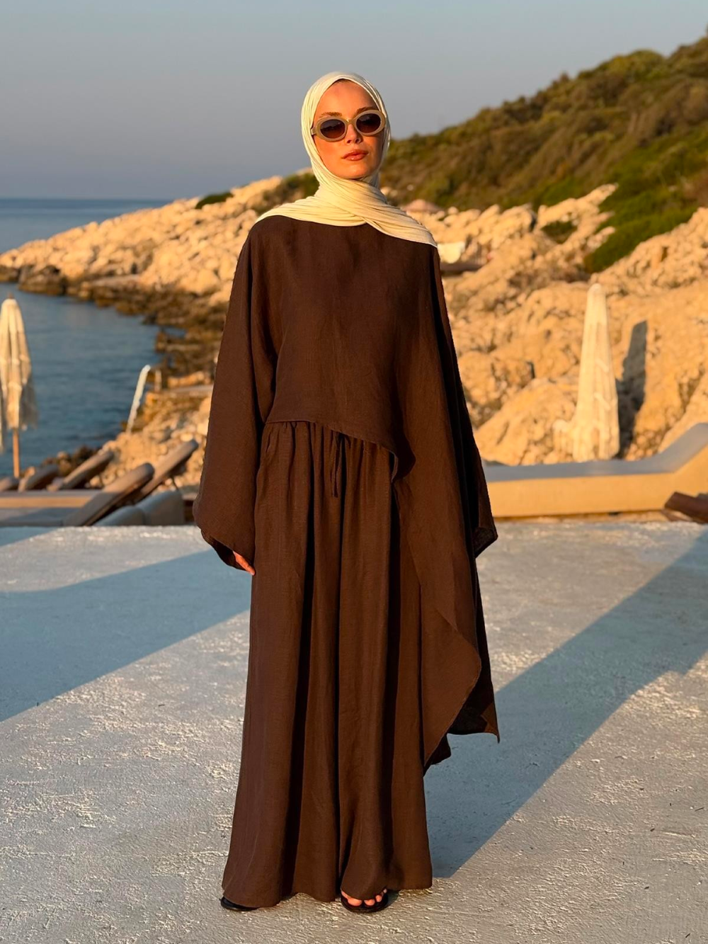 Made from 100% linen, this airy cape top features a striking asymmetrical cut with one side longer for a modern, effortless look. Lightweight, breathable, and easy to style.