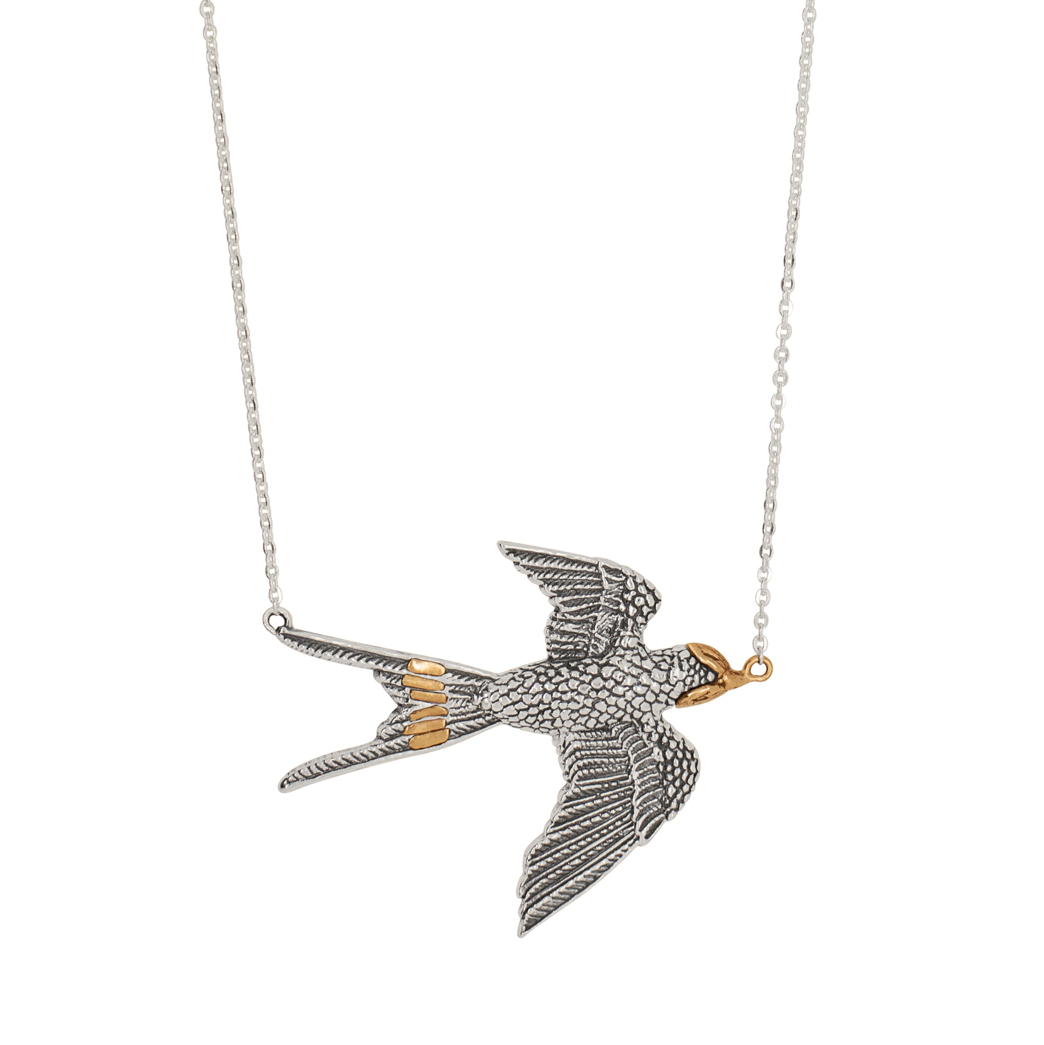 A soaring barn swallow pendant is affixed to a delicate sterling silver cable chain to create the Barn Swallow Necklace. Each piece is intricately carved and cast to give these agile birds all their glorious details. This necklace is the perfect tribute to their cheery morning chirps, evening air shows, and regular reminders that life is messy and beautiful.