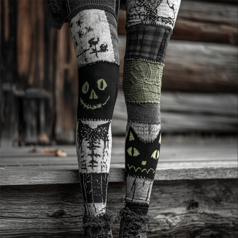 Halloween Black Cat Colorblock Patchwork Cozy Knit Leggings