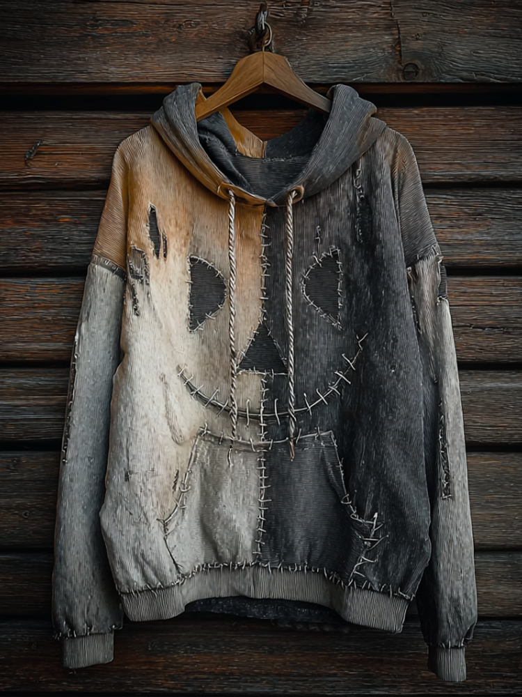 Halloween Ghost Face Distressed Patchwork Hooded Sweatshirt