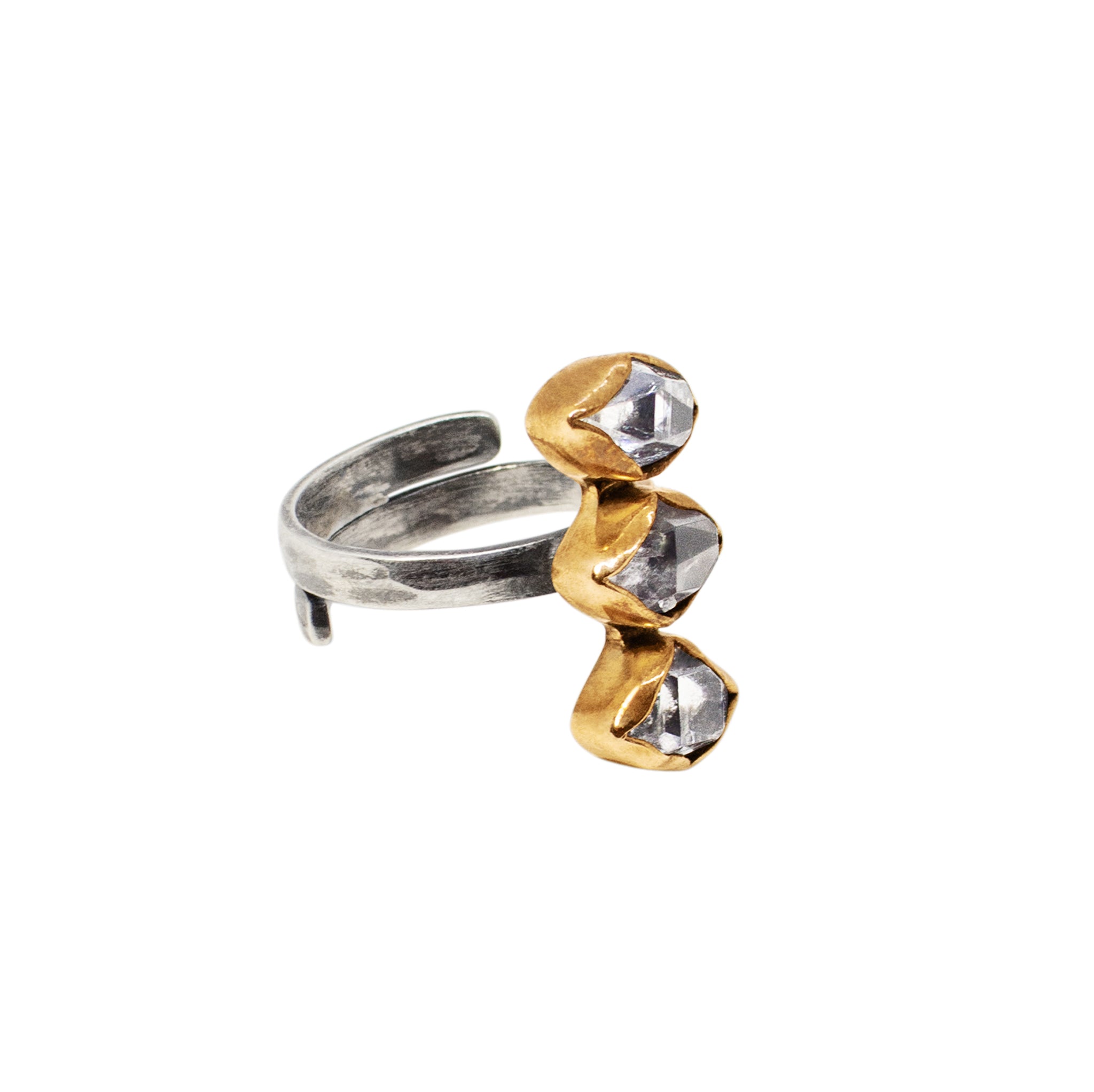 The Herkimer totem ring features three organically formed, double-terminating Herkimer Diamonds vertically stacked, bezel-set in bronze, and affixed to an antiqued sterling silver band.