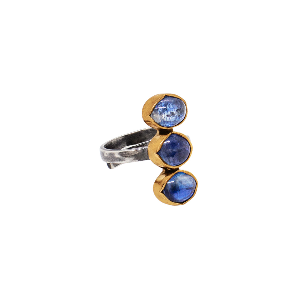 The Kyanite Totem Ring features three smooth and watery kyanite stones vertically stacked, bezel-set in bronze, and affixed to an antiqued sterling silver band. The stone is believed to reduce stress and anxiety & the vibe is cool and calm.