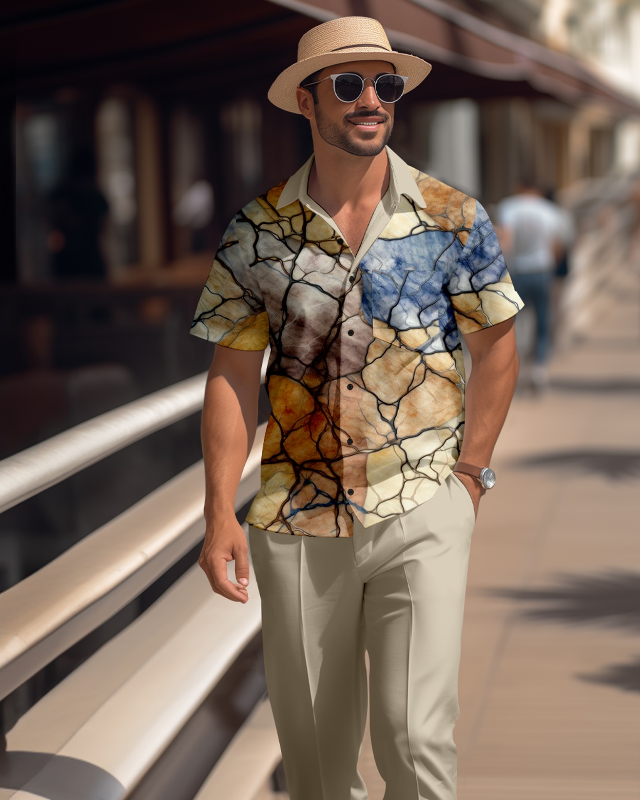 Men's retro colorblock short-sleeved shirt walking Suit 1674