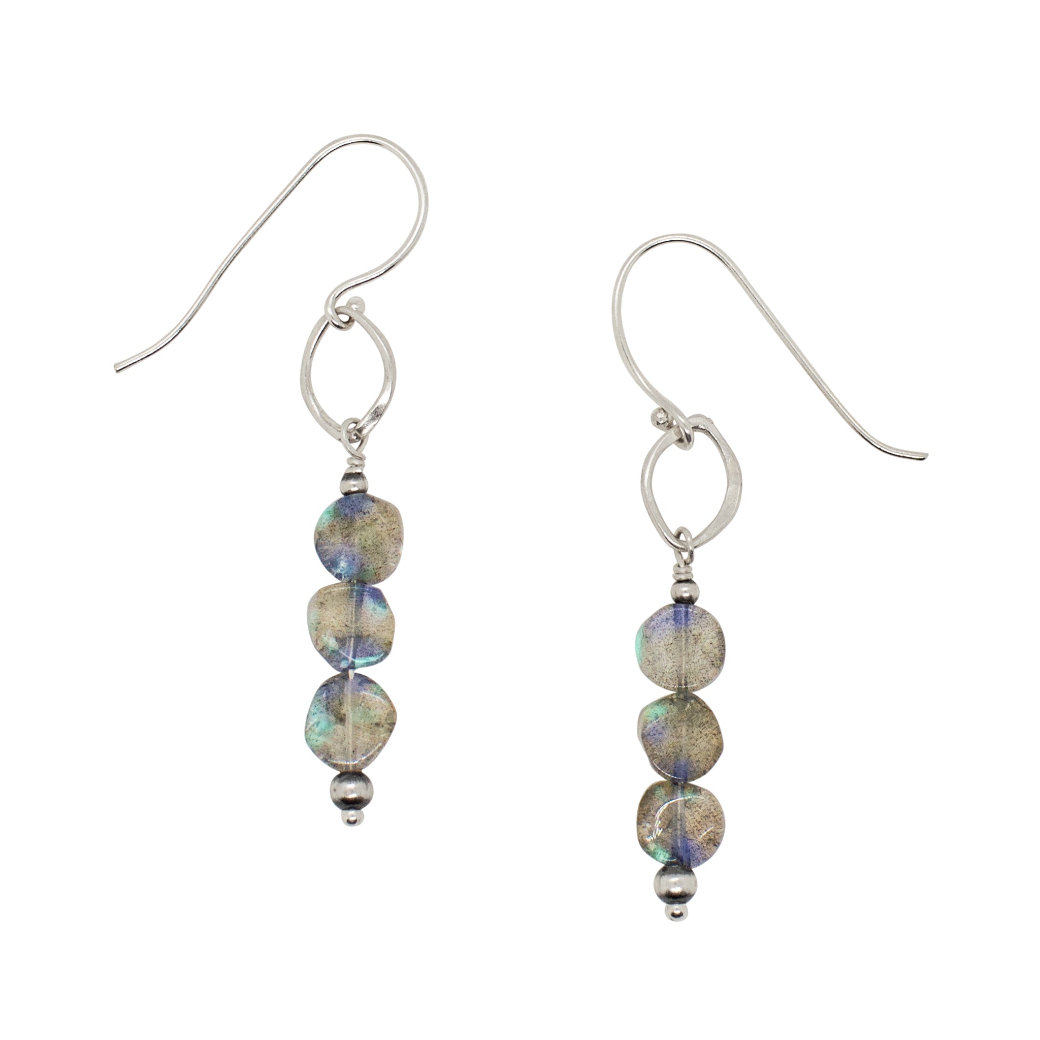 Our Moons in Orbit Earrings feature three stacked labradorite coins framed on either end with sterling silver beads and dangling from a delicate sterling silver ring—the fiery blue greys of the labradorite catch the light with every movement.