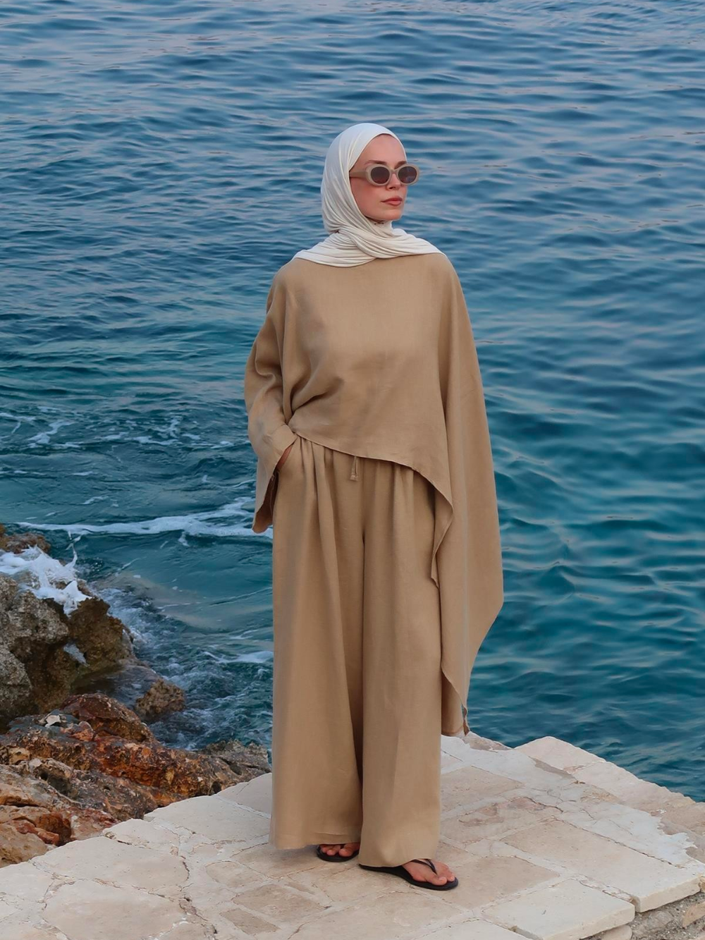 Made from 100% linen, this airy cape top features a striking asymmetrical cut with one side longer for a modern, effortless look. Lightweight, breathable, and easy to style.