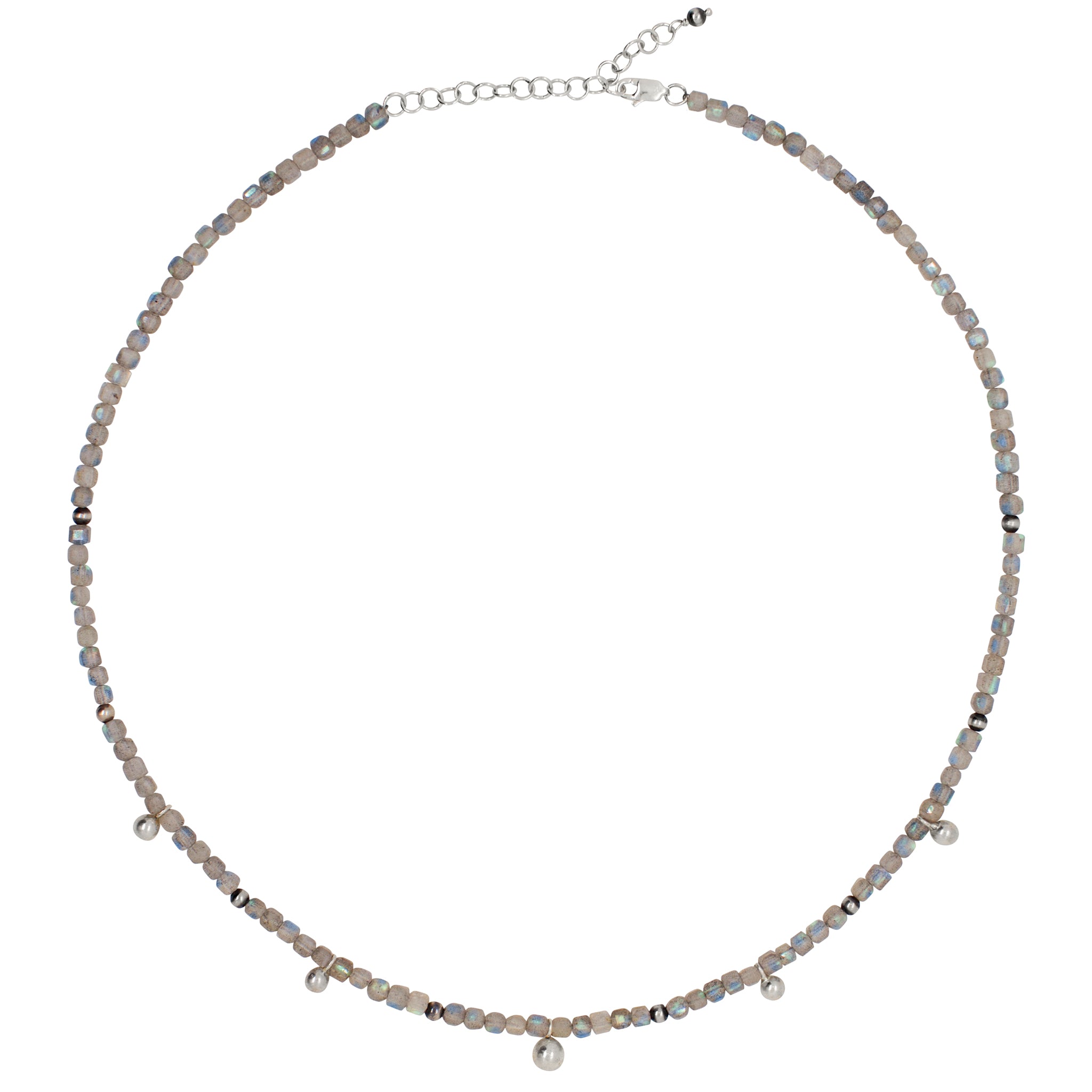Our On the Dot Necklace is arriving right on time to add to your stone strand collection. Hand-cut labradorite stones are the star of this necklace and their fiery blue grey beauty is accented with sterling silver beads.