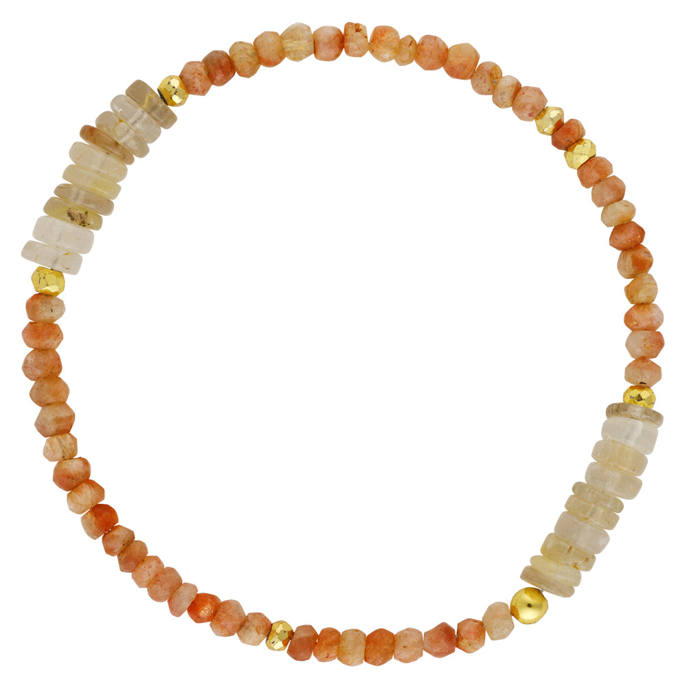 - Sunstone, golden rutilated quartz heishi, plated pyrite.
