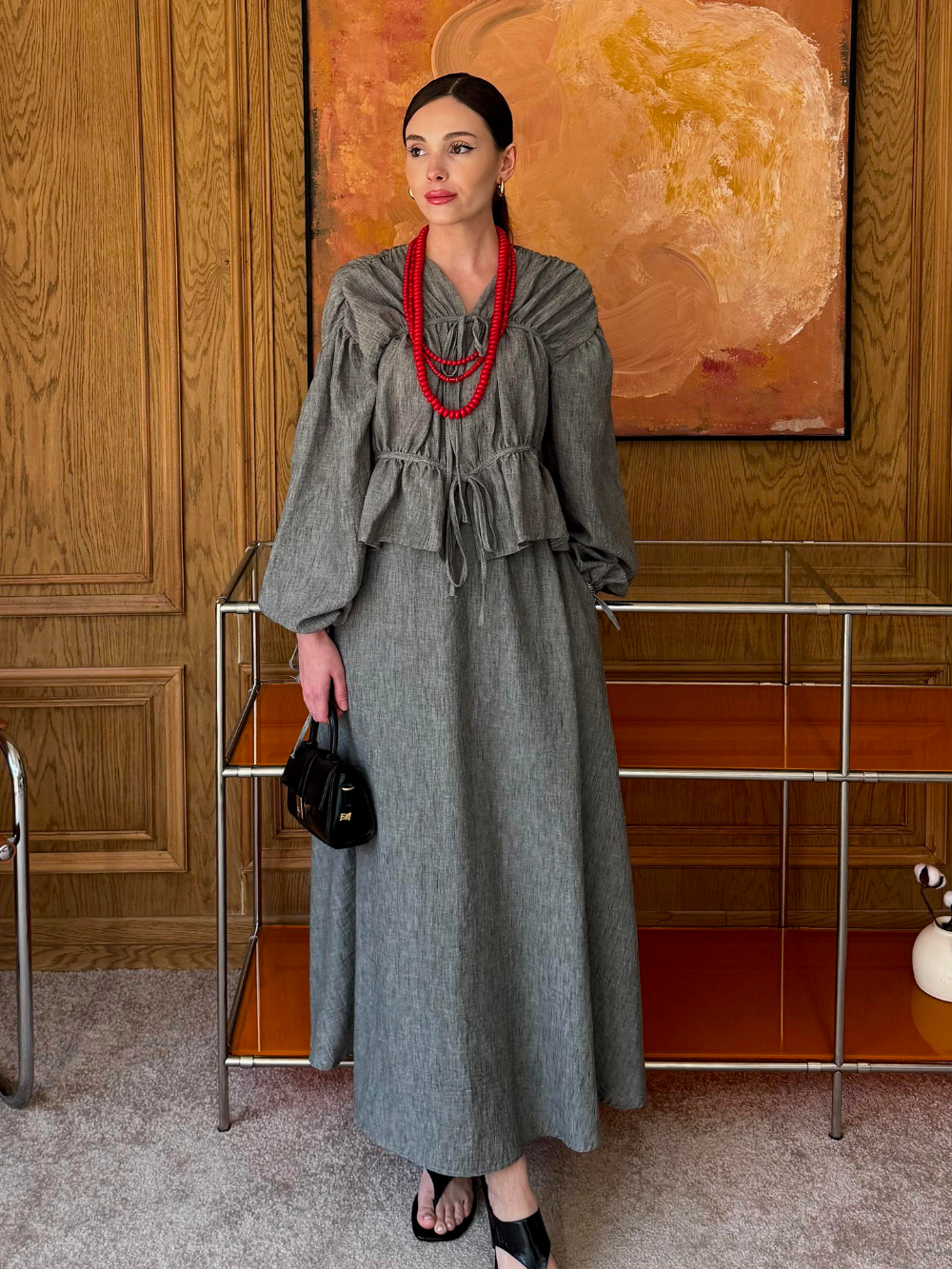 Semra Shirt and Skirt Set with Gathered Pipinga lightweight set featuring delicate gathered piping and a relaxed fit. Perfect for effortless, natural elegance..