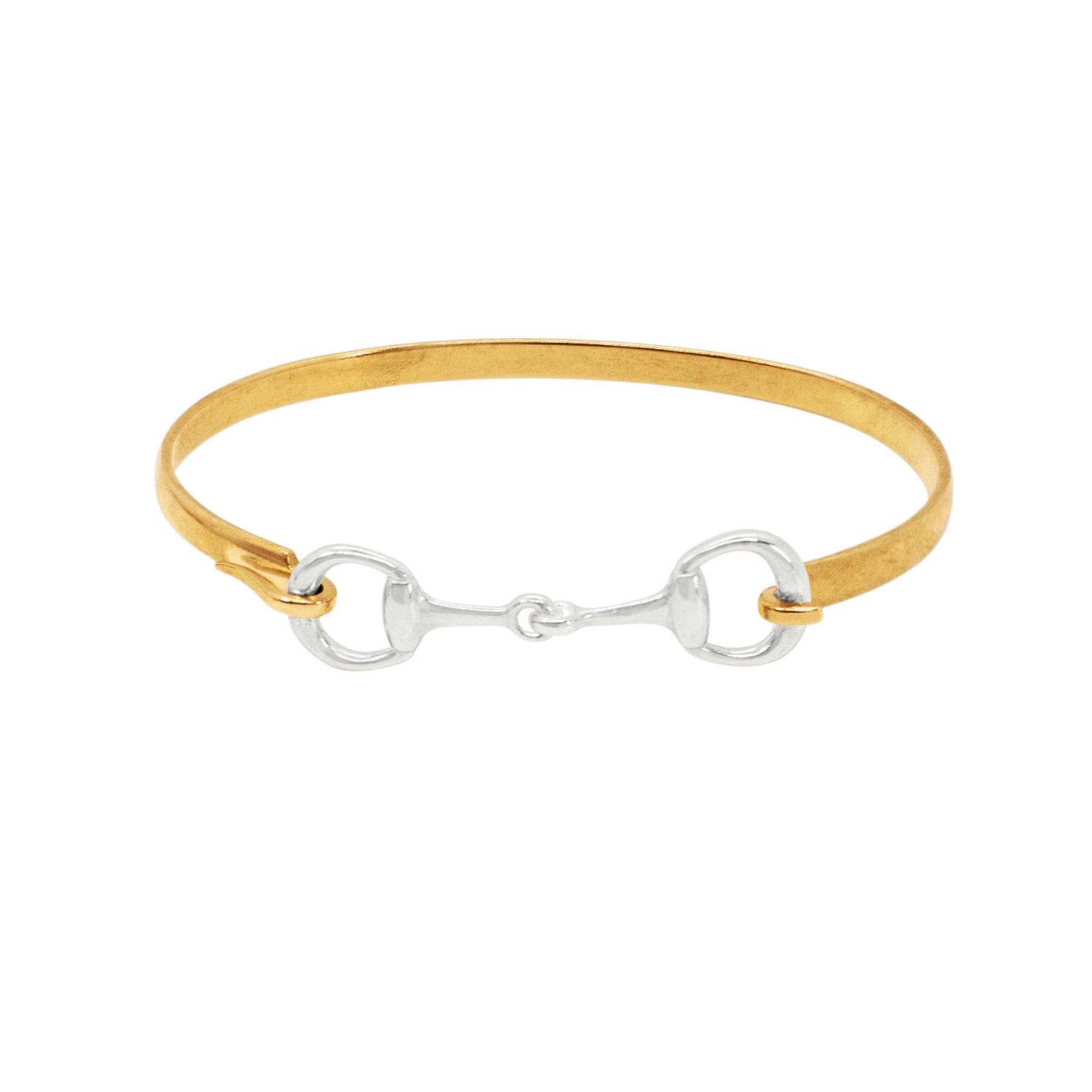 We were chomping at the bit to bring this design to life ;) A hand-hammered band features a snaffle bit design, adding intricacy and functionality to this piece. This unique closure can be easily opened and closed by releasing either loop from the hooked end of the bracelet and fastening it back into place. The Snaffle Bit Bracelet looks great worn solo or stacked.