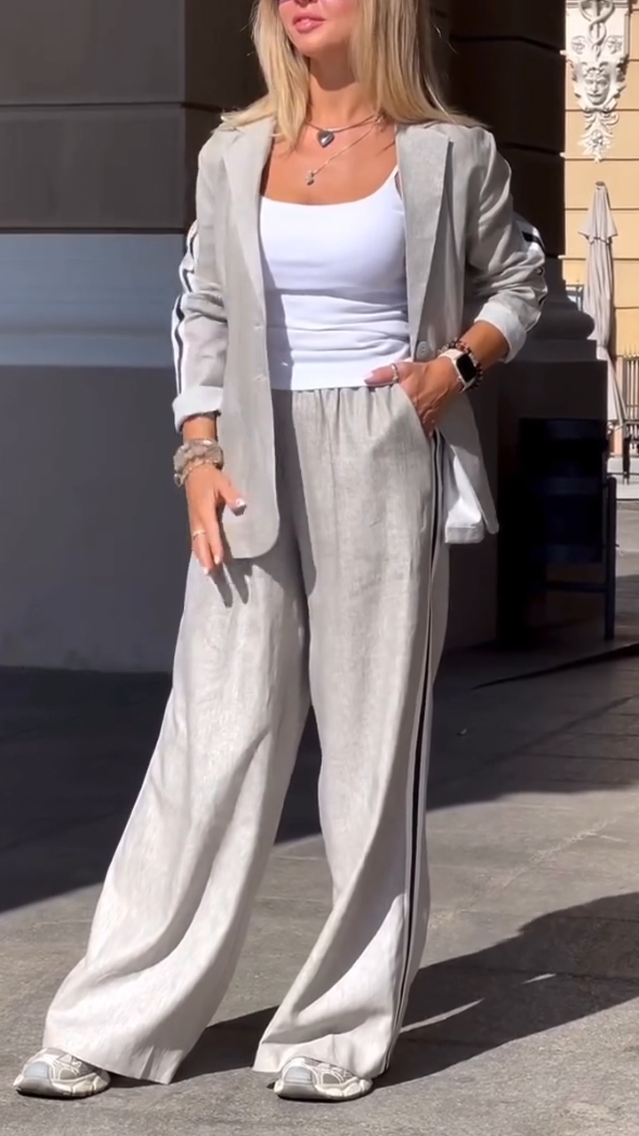 Upgrade your wardrobe with this modern two-piece set featuring a relaxed-fit blazer and wide-leg pants. Designed for both comfort and style, this outfit effortlessly blends street style with smart casual elegance. Whether for city strolls, brunch dates, or casual office days, this versatile set keeps you looking polished and confident.