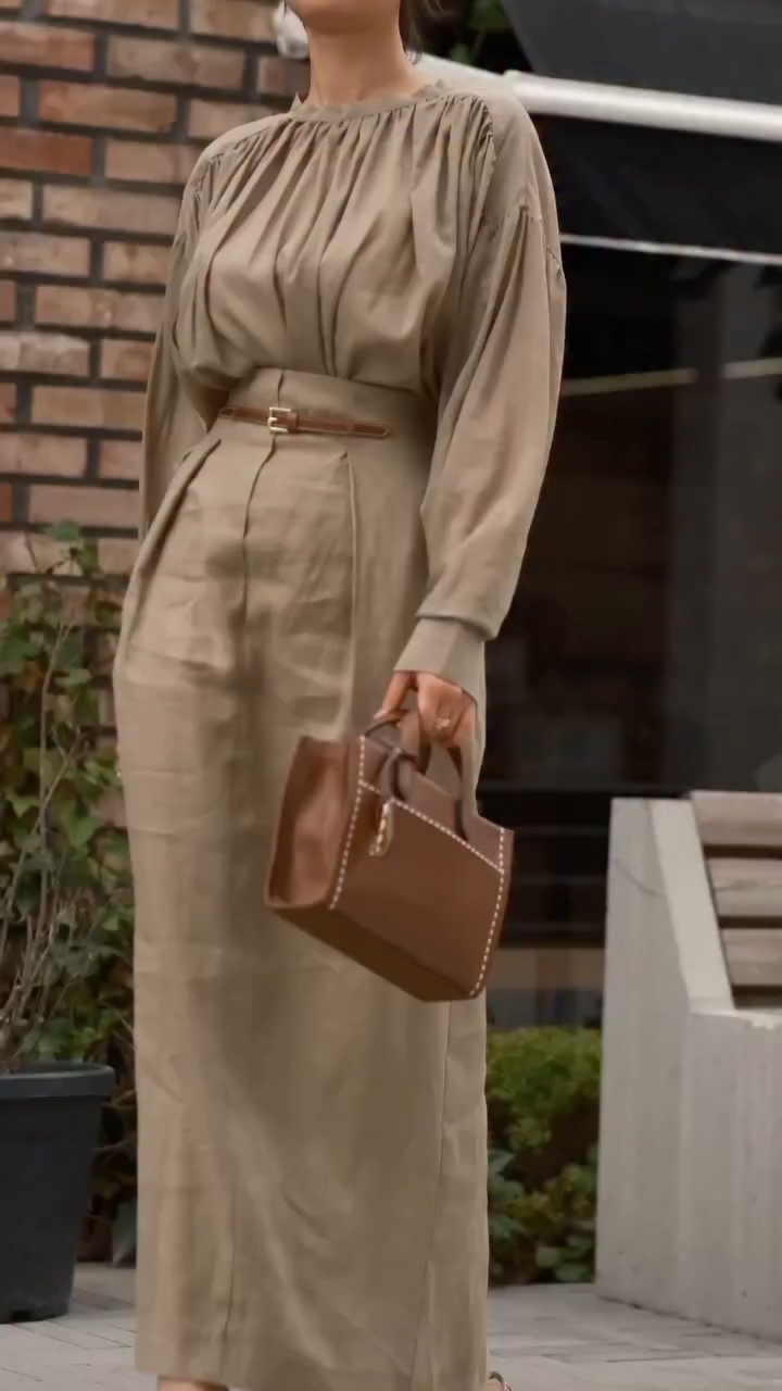 Elevate your wardrobe with this sophisticated neutral-toned belted midi dress, designed for women who value effortless elegance and understated luxury. Featuring soft pleats along the neckline, relaxed long sleeves, and a cinched waist belt, this dress delivers a streamlined silhouette that flatters every figure.