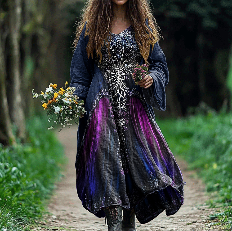 Women's Vintage Viking Tree Of Life Gradient Pattern Long Sleeve Dress