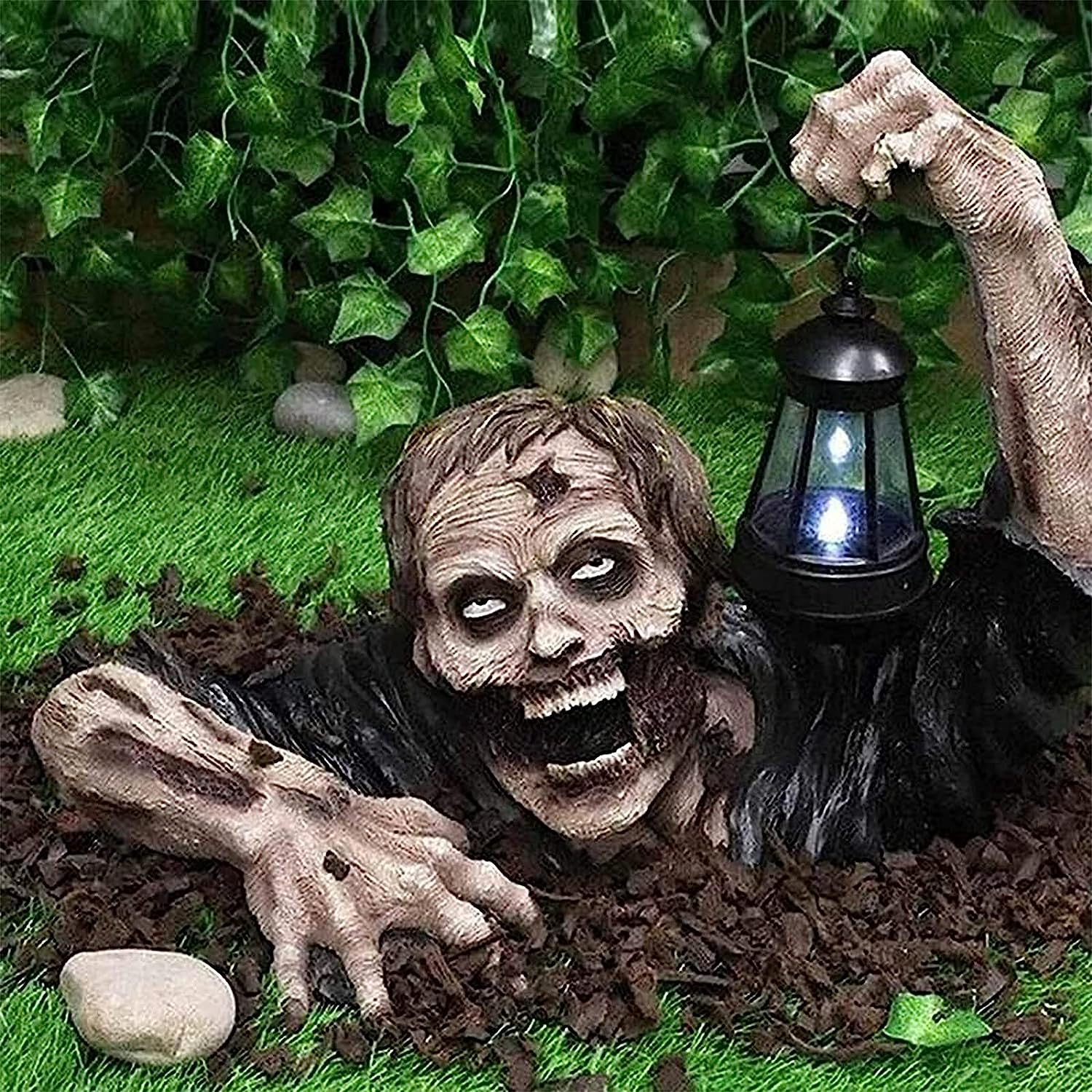 With its solar-powered LED lantern, this statue illuminates your garden with an eerie glow as darkness falls. Crafted with attention to detail, the statue captures the terrifying essence of a zombie, making it an eye-catching centerpiece for any Halloween-themed garden or haunted house.